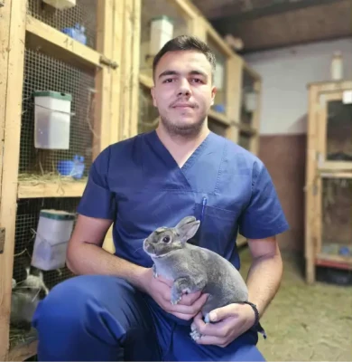 Alexandru: Pasiunea mea pentru animale a început din copilărie, când am crescut înconjurat de ele, într-un mediu unde grija față de vietăți era ceva firesc. De mic am avut o legătură specială cu animalele, iar în timp am descoperit bucuria de a mă ocupa de ele, în special de iepuri și păsări de rasă. Alegerea medicinei veterinare a venit natural — mi-am dorit să pot face mai mult decât să le îngrijesc: să pot contribui la sănătatea și bunăstarea lor în mod profesionist.