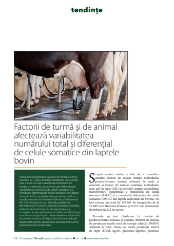 10 Veterinarul Ferm%u0103 pentru medicii veterinari l nr. 4 l www.veterinarul.roScopul acestui studiu a fost de a cuantifica anumi%u021bi factori de mediu (turme individuale, productivitatea turmei, sistemul de muls %u0219i sezonul) %u0219i factori de animali (animale individuale, ras%u0103, zile %u00een lapte (ZIL) %u0219i paritate) asupra variabilit%u0103%u021bii transform%u0103rii logaritmice a num%u0103rului de celule somatice (LSCC) %u0219i a num%u0103rului diferen%u021bial de celule somatice (DSCC) din laptele individual de bovin%u0103. Au fost extrase un total de 159.360 de %u00eenregistr%u0103ri de la 12.849 vaci Holstein-Friesian %u0219i 9.275 vaci Simmental distribuite %u00een 223 de turme.Turmele au fost clasificate %u00een func%u021bie de productivitatea ridicat%u0103 %u0219i sc%u0103zut%u0103, definit%u0103 %u00een func%u021bie de produc%u021bia medie net%u0103 de energie zilnic%u0103 (DMEO) ob%u021binut%u0103 de vaci. Datele au inclus produc%u021bia zilnic%u0103 de lapte (DYM; kg/zi), gr%u0103simea laptelui, proteina, Factorii de turm%u0103 %u0219i de animal afecteaz%u0103 variabilitatea num%u0103rului total %u0219i diferen%u021bial de celule somatice din laptele bovintendin%u021beAcest articol publicat %u00een Journal of Animal Science, volumul 101, 2023, prezint%u0103 rezultatele unui studiu care a avut ca scop cuantificarea factorilor de mediu %u0219i a factorilor de animali care influen%u021beaz%u0103 variabilitatea num%u0103rului de celule somatice %u0219i a num%u0103rului diferen%u021bial de celule somatice din laptele de vac%u0103. Au fost analizate date provenite de la un num%u0103r mare de vaci Holstein-Friesian %u0219i Simmental din 223 de turme %u0219i s-au identificat diferen%u021be semnificative %u00een func%u021bie de productivitatea turmelor, sistemul de muls %u0219i sezon. De asemenea, s-a constatat c%u0103 rasa, paritatea %u0219i num%u0103rul de zile %u00een lapte sunt factori importan%u021bi %u00een determinarea con%u021binutului de celule somatice din lapte. Studiul are implica%u021bii importante pentru gestionarea s%u0103n%u0103t%u0103%u021bii mamare la nivel de turm%u0103 %u0219i individual.