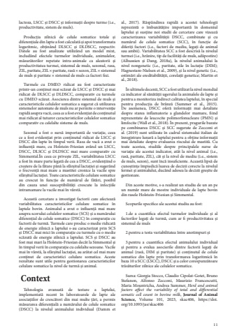 11lactoza, LSCC %u0219i DSCC %u0219i informa%u021bii despre turme (i.e., productivitate, sistem de muls).Produc%u021bia zilnic%u0103 de celule somatice totale %u0219i diferen%u021biale din lapte a fost calculat%u0103 %u0219i apoi transformata logaritmic, ob%u021bin%u00e2nd DLSCC %u0219i DLDSCC, respectiv. Datele au fost analizate utiliz%u00e2nd un model mixt, includ%u00e2nd efectele turmelor individuale, animalelor, m%u0103sur%u0103torilor repetate intra-animale ca aleatorii %u0219i productivitatea turmei, sistemul de muls, sezonul, rasa, ZIL, paritate, ZIL %u00d7 paritate, ras%u0103 %u00d7 sezon, ZIL %u00d7 sistemul de muls %u0219i paritate %u00d7 sistemul de muls ca factori fixi.Turmele cu DMEO ridicat au fost caracterizate printr-un con%u021binut mai sc%u0103zut de LSCC %u0219i DSCC %u0219i mai ridicat de DLSCC %u0219i DLDSCC, comparativ cu turmele cu DMEO sc%u0103zut. Asocierea dintre sistemul de muls %u0219i caracteristicile celulelor somatice a sugerat c%u0103 utilizarea sistemelor automate de muls nu ar permite o interven%u021bie rapid%u0103 asupra vacii, ceea ce a fost eviden%u021biat de con%u021binutul mai ridicat al tuturor caracteristicilor celulelor somatice comparativ cu celelalte sisteme de muls.Sezonul a fost o surs%u0103 important%u0103 de varia%u021bie, ceea ce a fost eviden%u021biat prin con%u021binutul ridicat de LSCC %u0219i DSCC din lapte %u00een timpul verii. Rasa de vac%u0103 a avut o influen%u021b%u0103 mare, cu Holstein-Friesian av%u00e2nd un LSCC, DSCC, DLSCC %u0219i DLDSCC mai mare comparativ cu Simmental.%u00cen ceea ce prive%u0219te ZIL, variabilitatea LSCC a fost %u00een mare parte legat%u0103 de cea a DSCC, eviden%u021biind o cre%u0219tere de la f%u0103tare p%u00e2n%u0103 la sf%u00e2r%u0219itul lacta%u021biei %u0219i suger%u00e2nd o frecven%u021b%u0103 mai mare a mastitei cronice la vacile spre sf%u00e2r%u0219itul lacta%u021biei. Toate caracteristicile celulare somatice au crescut %u00een func%u021bie de num%u0103rul de f%u0103t%u0103ri, posibil din cauza unei susceptibilit%u0103%u021bi crescute la infec%u021biile intramamare la vacile mai %u00een v%u00e2rst%u0103.Aceast%u0103 cercetare a investigat factorii care afecteaz%u0103 variabilitatea caracteristicilor celulare somatice %u00een laptele bovin. Animalul a avut o influen%u021b%u0103 mai mare asupra scorului celulelor somatice (SCS) %u0219i a num%u0103rului diferen%u021bial de celule somatice (DSCC) %u00een compara%u021bie cu factorii de turm%u0103. Turmele care produc o medie ridicat%u0103 de energie zilnic%u0103 a laptelui s-au caracterizat prin SCS %u0219i DSCC mai mici %u00een compara%u021bie cu turmele cu o medie sc%u0103zut%u0103 de energie zilnic%u0103 a laptelui. SCS %u0219i DSCC au fost mai mari la Holstein-Friesian dec%u00e2t la Simmental %u0219i %u00een timpul verii %u00een compara%u021bie cu celelalte sezoane. Vacile mai %u00een v%u00e2rst%u0103, la sf%u00e2r%u0219itul lacta%u021biei, au ar%u0103tat cel mai mare con%u021binut de caracteristici celulare somatice. Aceste rezultate sunt utile pentru gestionarea caracteristicilor celulare somatice la nivel de turm%u0103 %u0219i animal. ContextTehnologia avansat%u0103 de testare a laptelui, implementat%u0103 recent %u00een laboratoarele de lapte ale asocia%u021biilor de cresc%u0103tori din mai multe %u021b%u0103ri, a permis m%u0103surarea diferen%u021bial%u0103 a num%u0103rului de celule somatice (DSCC) la nivelul animalului individual (Damm et al., 2017). R%u0103sp%u00e2ndirea rapid%u0103 a acestei tehnologii reprezint%u0103 o %u00eembun%u0103t%u0103%u021bire important%u0103 %u00een domeniul laptelui %u0219i sus%u021bine noi studii de cercetare care vizeaz%u0103 caracterizarea variabilit%u0103%u021bii DSCC, combinate %u0219i cu num%u0103rul de celule somatice (SCC), %u00een func%u021bie de diferi%u021bi factori (i.e., factori de mediu, lega%u021bi de animal sau ambii). Variabilitatea SCC a fost descris%u0103 la nivelul turmei (i.e., hr%u0103nire, tip de facilit%u0103%u021bi de muls, ad%u0103postire) (Alhussien %u0219i Dang, 2018a), la nivelul animalului la nivel nongenetic (i.e., paritate, zile %u00een lacta%u021bie (DIM); Hagnestam-Nielsen et al., 2009), %u0219i la nivel genetic (i.e., estim%u0103ri ale ereditabilit%u0103%u021bii, corela%u021bii genetice; Martin et al., 2018).%u00cen ultimele decenii, SCC a fost utilizat la nivel mondial ca indicator al s%u0103n%u0103t%u0103%u021bii ugerului la animalele de lapte %u0219i pentru a monitoriza indirect calitatea laptelui, %u00een special pentru produc%u021bia de br%u00e2nz%u0103 (Summer et al., 2015). De asemenea, DSCC ofer%u0103 informa%u021bii mai detaliate despre starea inflamatorie a glandelor mamare, fiind reprezentate de leucocite polimorfonucleare (PMN) %u0219i limfocite (Wall et al., 2018). %u00cen prezent, pragurile bazate pe combinarea DSCC %u0219i SCC sugerate de Zecconi et al. (2019) sunt utilizate %u00een cadrul sistemului italian de %u00eenregistrare lunar%u0103 a laptelui pentru a ob%u021bine informa%u021bii mai detaliate despre evaluarea riscului de mastit%u0103. Cu toate acestea, studiile despre principalele surse de varia%u021bie ale acestui indicator, at%u00e2t la nivel animal (i.e., ras%u0103, paritate, ZIL), c%u00e2t %u0219i la nivel de mediu (i.e., sistem de muls, sezon), sunt %u00eenc%u0103 insuficiente. Aceast%u0103 lips%u0103 de cuno%u0219tin%u021be %u00eempiedic%u0103 luarea de decizii corecte la nivelul fermei %u0219i animalului, duc%u00e2nd adesea la decizii gre%u0219ite de gestionare.Din aceste motive, s-a realizat un studiu de un an pe un num%u0103r mare de mostre individuale de lapte bovin din rasele Holstein-Friesian %u0219i Simmental.Scopurile specifice ale acestui studiu au fost:1.de a cuantifica efectul turmelor individuale %u0219i al factorilor lega%u021bi de turm%u0103, cum ar fi productivitatea %u0219i sistemul de muls2.pentru a testa variabilitatea %u00eentre anotimpuri %u0219i3.pentru a cuantifica efectul animalului individual %u0219i pentru a evalua asocier