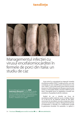 14 Veterinarul Ferm%u0103 pentru medicii veterinari l nr. 4 l www.veterinarul.roAcest articol se concentreaz%u0103 pe impactul virusului encefalomiocarditei (EMCV) asupra porcilor, care sunt considera%u021bi cea mai sensibil%u0103 specie domestic%u0103 la acest virus. EMCV a fost izolat pentru prima dat%u0103 %u00een fermele de porci %u00een 1958 %u00een Panama %u0219i %u00een Europa %u0219i este frecvent asociat cu miocardita fatal%u0103 %u0219i moartea subit%u0103 la porcii tineri. Principalul factor %u00een r%u0103sp%u00e2ndirea virusului este considerat a fi popula%u021bia local%u0103 de roz%u0103toare.Studiul de caz a abordat un focar de encefalomiocardit%u0103 viral%u0103 %u00eentr-un loc de f%u0103tare (ferma A) %u0219i %u00eentr-un loc de %u00een%u021b%u0103rcare (ferma B) din Italia, caracterizat de mortalitate crescut%u0103 %u0219i simptome clinice cauzate de insuficien%u021ba cardiac%u0103. Managementul eficient al roz%u0103toarelor s-a dovedit a fi o component%u0103 crucial%u0103 %u00een gestionarea focarului. De asemenea, s-a aplicat o Managementul infec%u021biei cu virusul encefalomiocarditei %u00een fermele de porci din Italia: un studiu de caz%u00cen luna februarie a acestui an, BMC Veterinary Research a publicat un studiu de caz intitulat %u201eManagementul infec%u021biei cu virusul encefalomiocarditei %u00een fermele de porci din Italia: un studiu de caz%u201d, realizat de A. Scollo, C. Mazzoni %u0219i A. Luppi.tendin%u021be
