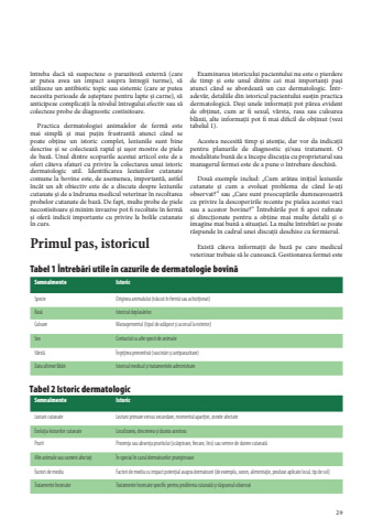 29%u00eentreba dac%u0103 s%u0103 suspecteze o parazitoz%u0103 extern%u0103 (care ar putea avea un impact asupra %u00eentregii turme), s%u0103 utilizeze un antibiotic topic sau sistemic (care ar putea necesita perioade de a%u0219teptare pentru lapte %u0219i carne), s%u0103 anticipeze complica%u021bii la nivelul %u00eentregului efectiv sau s%u0103 colecteze probe de diagnostic costisitoare.Practica dermatologiei animalelor de ferm%u0103 este mai simpl%u0103 %u0219i mai pu%u021bin frustrant%u0103 atunci c%u00e2nd se poate ob%u021bine un istoric complet, leziunile sunt bine descrise %u0219i se colecteaz%u0103 rapid %u0219i u%u0219or mostre de piele de baz%u0103. Unul dintre scopurile acestui articol este de a oferi c%u00e2teva sfaturi cu privire la colectarea unui istoric dermatologic util. Identificarea leziunilor cutanate comune la bovine este, de asemenea, important%u0103, astfel %u00eenc%u00e2t un alt obiectiv este de a discuta despre leziunile cutanate %u0219i de a %u00eendruma medicul veterinar %u00een recoltarea probelor cutanate de baz%u0103. De fapt, multe probe de piele necostisitoare %u0219i minim invazive pot fi recoltate %u00een ferm%u0103 %u0219i ofer%u0103 indicii importante cu privire la bolile cutanate %u00een curs.Primul pas, istoriculExaminarea istoricului pacientului nu este o pierdere de timp %u0219i este unul dintre cei mai importan%u021bi pa%u0219i atunci c%u00e2nd se abordeaz%u0103 un caz dermatologic. %u00centradev%u0103r, detaliile din istoricul pacientului sus%u021bin practica dermatologic%u0103. De%u0219i unele informa%u021bii pot p%u0103rea evident de ob%u021binut, cum ar fi sexul, v%u00e2rsta, rasa sau culoarea bl%u0103nii, alte informa%u021bii pot fi mai dificil de ob%u021binut (vezi tabelul 1). Acestea necesit%u0103 timp %u0219i aten%u021bie, dar vor da indica%u021bii pentru planurile de diagnostic %u0219i/sau tratament. O modalitate bun%u0103 de a %u00eencepe discu%u021bia cu proprietarul sau managerul fermei este de a pune o %u00eentrebare deschis%u0103. Dou%u0103 exemple includ: %u201eCum ar%u0103tau ini%u021bial leziunile cutanate %u0219i cum a evoluat problema de c%u00e2nd le-a%u021bi observat?%u201d sau %u201eCare sunt preocup%u0103rile dumneavoastr%u0103 cu privire la descoperirile recente pe pielea acestei vaci sau a acestor bovine?%u201d %u00centreb%u0103rile pot fi apoi rafinate %u0219i direc%u021bionate pentru a ob%u021bine mai multe detalii %u0219i o imagine mai bun%u0103 a situa%u021biei. La multe %u00eentreb%u0103ri se poate r%u0103spunde %u00een cadrul unei discu%u021bii deschise cu fermierul. Exist%u0103 c%u00e2teva informa%u021bii de baz%u0103 pe care medicul veterinar trebuie s%u0103 le cunoasc%u0103. Gestionarea fermei este Semnalmente IstoricSpecie Originea animalului (n%u0103scut %u00een ferm%u0103 sau achizi%u021bionat)Ras%u0103 Istoricul deplas%u0103rilorCuloare Managementul (tipul de ad%u0103post %u0219i accesul la exterior)Sex Contactul cu alte specii de animaleV%u00e2rst%u0103 %u00cengrijirea preventiv%u0103 (vaccin%u0103ri %u0219i antiparazitare)Data ultimei f%u0103t%u0103ri Istoricul medical %u0219i tratamentele administrateSemnalmente IstoricLeziuni cutanate Leziuni primare versus secundare, momentul apari%u021biei, zonele afectateEvolu%u021bia leziunilor cutanate Localizarea, descrierea %u0219i durata acestoraPrurit Prezen%u021ba sau absen%u021ba pruritului (sc%u0103rpinare, frecare, lins) sau semne de durere cutanat%u0103Alte animale sau oameni afecta%u021bi %u00cen special %u00een cazul dermatozelor pruriginoaseFactori de mediu Factori de mediu cu impact poten%u021bial asupra dermatozei (de exemplu, sezon, alimenta%u021bie, produse aplicate local, tip de sol)Tratamente %u00eencercate Tratamente %u00eencercate specific pentru problema cutanat%u0103 %u0219i r%u0103spunsul observatTabel 2 Istoric dermatologicTabel 1 %u00centreb%u0103ri utile %u00een cazurile de dermatologie bovin%u0103
