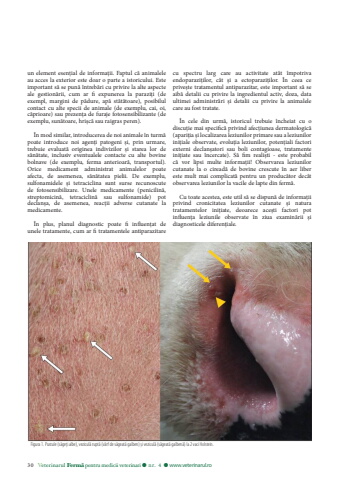 30 Veterinarul Ferm%u0103 pentru medicii veterinari l nr. 4 l www.veterinarul.roun element esen%u021bial de informa%u021bii. Faptul c%u0103 animalele au acces la exterior este doar o parte a istoricului. Este important s%u0103 se pun%u0103 %u00eentreb%u0103ri cu privire la alte aspecte ale gestion%u0103rii, cum ar fi expunerea la parazi%u021bi (de exempl, margini de p%u0103dure, ap%u0103 st%u0103t%u0103toare), posibilul contact cu alte specii de animale (de exemplu, cai, oi, c%u0103prioare) sau prezen%u021ba de furaje fotosensibilizante (de exemplu, sun%u0103toare, hri%u0219c%u0103 sau raigras peren).%u00cen mod similar, introducerea de noi animale %u00een turm%u0103 poate introduce noi agen%u021bi patogeni %u0219i, prin urmare, trebuie evaluat%u0103 originea indivizilor %u0219i starea lor de s%u0103n%u0103tate, inclusiv eventualele contacte cu alte bovine bolnave (de exemplu, ferma anterioar%u0103, transportul). Orice medicament administrat animalelor poate afecta, de asemenea, s%u0103n%u0103tatea pielii. De exemplu, sulfonamidele %u0219i tetraciclina sunt surse recunoscute de fotosensibilizare. Unele medicamente (penicilin%u0103, streptomicin%u0103, tetraciclin%u0103 sau sulfonamide) pot declan%u0219a, de asemenea, reac%u021bii adverse cutanate la medicamente.%u00cen plus, planul diagnostic poate fi influen%u021bat de unele tratamente, cum ar fi tratamentele antiparazitare cu spectru larg care au activitate at%u00e2t %u00eempotriva endoparazi%u021bilor, c%u00e2t %u0219i a ectoparazi%u021bilor. %u00cen ceea ce prive%u0219te tratamentul antiparazitar, este important s%u0103 se aib%u0103 detalii cu privire la ingredientul activ, doza, data ultimei administr%u0103ri %u0219i detalii cu privire la animalele care au fost tratate.%u00cen cele din urm%u0103, istoricul trebuie %u00eencheiat cu o discu%u021bie mai specific%u0103 privind afec%u021biunea dermatologic%u0103 (apari%u021bia %u0219i localizarea leziunilor primare sau a leziunilor ini%u021biale observate, evolu%u021bia leziunilor, poten%u021biali factori externi declan%u0219atori sau boli contagioase, tratamente ini%u021biate sau %u00eencercate). S%u0103 fim reali%u0219ti - este probabil c%u0103 vor lipsi multe informa%u021bii! Observarea leziunilor cutanate la o ciread%u0103 de bovine crescute %u00een aer liber este mult mai complicat%u0103 pentru un produc%u0103tor dec%u00e2t observarea leziunilor la vacile de lapte din ferm%u0103. Cu toate acestea, este util s%u0103 se dispun%u0103 de informa%u021bii privind cronicitatea leziunilor cutanate %u0219i natura tratamentelor ini%u021biate, deoarece ace%u0219ti factori pot influen%u021ba leziunile observate %u00een ziua examin%u0103rii %u0219i diagnosticele diferen%u021biale.Figura 1. Pustule (s%u0103ge%u021bi albe), vezicul%u0103 rupt%u0103 (v%u00e2rf de s%u0103geat%u0103 galben) %u0219i vezicul%u0103 (s%u0103geat%u0103 galben%u0103) la 2 vaci Holstein.