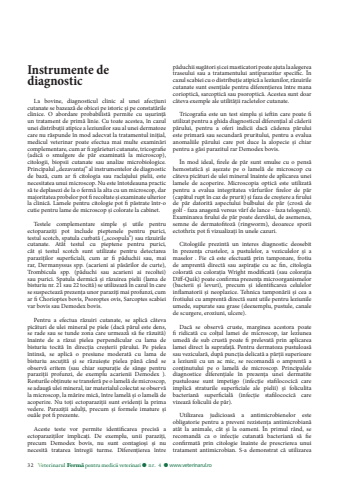 32 Veterinarul Ferm%u0103 pentru medicii veterinari l nr. 4 l www.veterinarul.roInstrumente de diagnosticLa bovine, diagnosticul clinic al unei afec%u021biuni cutanate se bazeaz%u0103 de obicei pe istoric %u0219i pe constat%u0103rile clinice. O abordare probabilist%u0103 permite cu u%u0219urin%u021b%u0103 un tratament de prim%u0103 linie. Cu toate acestea, %u00een cazul unei distribu%u021bii atipice a leziunilor sau al unei dermatoze care nu r%u0103spunde %u00een mod adecvat la tratamentul ini%u021bial, medicul veterinar poate efectua mai multe examin%u0103ri complementare, cum ar fi zg%u00e2rieturi cutanate, tricografie (adic%u0103 o smulgere de p%u0103r examinat%u0103 la microscop), citologii, biopsii cutanate sau analize microbiologice. Principalul %u201edezavantaj%u201d al instrumentelor de diagnostic de baz%u0103, cum ar fi citologia sau raclajului pielii, este necesitatea unui microscop. Nu este %u00eentotdeauna practic s%u0103 te deplasezi de la o ferm%u0103 la alta cu un microscop, dar majoritatea probelor pot fi recoltate %u0219i examinate ulterior la clinic%u0103. Lamele pentru citologie pot fi p%u0103strate %u00eentr-o cutie pentru lame de microscop %u0219i colorate la cabinet. Testele complementare simple %u0219i utile pentru ectoparazi%u021bi pot include pieptenele pentru purici, testul scotch, spatula curbat%u0103 (%u201escoopula%u201d) sau r%u0103zuirile cutanate. At%u00e2t testul cu pieptene pentru purici, c%u00e2t %u0219i testul scotch sunt utilizate pentru detectarea parazi%u021bilor superficiali, cum ar fi p%u0103duchii sau, mai rar, Dermanyssus spp. (acarieni ai p%u0103s%u0103rilor de curte), Trombicula spp. (p%u0103duchi sau acarieni ai recoltei) sau purici. Spatula dermic%u0103 %u0219i r%u0103zuirea pielii (lama de bisturiu nr. 21 sau 22 tocit%u0103) se utilizeaz%u0103 %u00een cazul %u00een care se suspecteaz%u0103 prezen%u021ba unor parazi%u021bi mai profunzi, cum ar fi Chorioptes bovis, Psoroptes ovis, Sarcoptes scabiei var bovis sau Demodex bovis.Pentru a efectua r%u0103zuiri cutanate, se aplic%u0103 c%u00e2teva pic%u0103turi de ulei mineral pe piele (dac%u0103 p%u0103rul este dens, se rade sau se tunde zona care urmeaz%u0103 s%u0103 fie r%u0103zuit%u0103) %u00eenainte de a r%u0103zui pielea perpendicular cu lama de bisturiu tocit%u0103 %u00een direc%u021bia cre%u0219terii p%u0103rului. Pe pielea %u00eentins%u0103, se aplic%u0103 o presiune moderat%u0103 cu lama de bisturiu ascu%u021bit%u0103 %u0219i se r%u0103zuie%u0219te pielea p%u00e2n%u0103 c%u00e2nd se observ%u0103 eritem (sau chiar supura%u021bie de s%u00e2nge pentru parazi%u021bii profunzi, de exemplu acarienii Demodex ). Resturile ob%u021binute se transfer%u0103 pe o lamel%u0103 de microscop, se adaug%u0103 ulei mineral, iar materialul colectat se observ%u0103 la microscop, la m%u0103rire mic%u0103, %u00eentre lamel%u0103 %u0219i o lamel%u0103 de acoperire. Nu to%u021bi ectoparazi%u021bii sunt eviden%u021bi la prima vedere. Parazi%u021bii adul%u021bi, precum %u0219i formele imature %u0219i ou%u0103le pot fi prezente. Aceste teste vor permite identificarea precis%u0103 a ectoparazi%u021bilor implica%u021bi. De exemplu, unii parazi%u021bi, precum Demodex bovis, nu sunt contagio%u0219i %u0219i nu necesit%u0103 tratarea %u00eentregii turme. Diferen%u021bierea %u00eentre p%u0103duchii sug%u0103tori %u0219i cei masticatori poate ajuta la alegerea traseului sau a tratamentului antiparazitar specific. %u00cen cazul scabiei cu o distribu%u021bie atipic%u0103 a leziunilor, r%u0103zuirile cutanate sunt esen%u021biale pentru diferen%u021bierea %u00eentre mana corioptic%u0103, sarcoptic%u0103 sau psoroptic%u0103. Acestea sunt doar c%u00e2teva exemple ale utilit%u0103%u021bii racletelor cutanate.Tricografia este un test simplu %u0219i ieftin care poate fi utilizat pentru a ghida diagnosticul diferen%u021bial al c%u0103derii p%u0103rului, pentru a oferi indicii dac%u0103 c%u0103derea p%u0103rului este primar%u0103 sau secundar%u0103 pruritului, pentru a evalua anomaliile p%u0103rului care pot duce la alopecie %u0219i chiar pentru a g%u0103si parazitul rar Demodex bovis. %u00cen mod ideal, firele de p%u0103r sunt smulse cu o pens%u0103 hemostatic%u0103 %u0219i a%u0219ezate pe o lamel%u0103 de microscop cu c%u00e2teva pic%u0103turi de ulei mineral %u00eenainte de aplicarea unei lamele de acoperire. Microscopia optic%u0103 este utilizat%u0103 pentru a evalua integritatea v%u00e2rfurilor firelor de p%u0103r (cap%u0103tul rupt %u00een caz de prurit) %u0219i faza de cre%u0219tere a firului de p%u0103r datorit%u0103 aspectului bulbului de p%u0103r (cros%u0103 de golf - faza anagen%u0103 versus v%u00e2rf de lance - faza telogen%u0103). Examinarea firului de p%u0103r poate dezv%u0103lui, de asemenea, semne de dermatofitoz%u0103 (ringworm), deoarece sporii ectothrix pot fi vizualiza%u021bi %u00een unele cazuri.Citologiile prezint%u0103 un interes diagnostic deosebit %u00een prezen%u021ba crustelor, a pustulelor, a veziculelor %u0219i a maselor . Fie c%u0103 este efectuat%u0103 prin tamponare, frotiu de amprent%u0103 direct%u0103 sau aspira%u021bie cu ac fin, citologia colorat%u0103 cu colora%u021bia Wright modificat%u0103 (sau colora%u021bia Diff-Quik) poate confirma prezen%u021ba microorganismelor (bacterii %u0219i levuri), precum %u0219i identificarea celulelor inflamatorii %u0219i neoplazice. Tehnica tampon%u0103rii %u0219i cea a frotiului cu amprent%u0103 direct%u0103 sunt utile pentru leziunile umede, supurate sau grase (deexemplu, pustule, canale de scurgere, eroziuni, ulcere). Dac%u0103 se observ%u0103 cruste, marginea acestora poate fi ridicat%u0103 cu col%u021bul lamei de microscop, iar leziunea umed%u0103 de sub crust%u0103 poate fi prelevat%u0103 prin aplicarea lamei direct la suprafa%u021b%u0103. Pentru dermatoza pustuloas%u0103 sau vezicular%u0103, dup%u0103 punc%u021bia delicat%u0103 a p%u0103r%u021bii superioare a leziunii cu un ac mic, se recomand%u0103 o amprent%u0103 a con%u021binutului pe o lamel%u0103 de micro