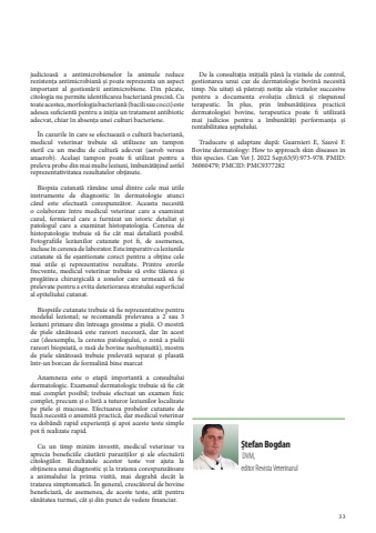 33judicioas%u0103 a antimicrobienelor la animale reduce rezisten%u021ba antimicrobian%u0103 %u0219i poate reprezenta un aspect important al gestion%u0103rii antimicrobiene. Din p%u0103cate, citologia nu permite identificarea bacterian%u0103 precis%u0103. Cu toate acestea, morfologia bacterian%u0103 (bacili sau cocci) este adesea suficient%u0103 pentru a ini%u021bia un tratament antibiotic adecvat, chiar %u00een absen%u021ba unei culturi bacteriene. %u00cen cazurile %u00een care se efectueaz%u0103 o cultur%u0103 bacterian%u0103, medicul veterinar trebuie s%u0103 utilizeze un tampon steril cu un mediu de cultur%u0103 adecvat (aerob versus anaerob). Acela%u0219i tampon poate fi utilizat pentru a preleva probe din mai multe leziuni, %u00eembun%u0103t%u0103%u021bind astfel reprezentativitatea rezultatelor ob%u021binute.Biopsia cutanat%u0103 r%u0103m%u00e2ne unul dintre cele mai utile instrumente de diagnostic %u00een dermatologie atunci c%u00e2nd este efectuat%u0103 corespunz%u0103tor. Aceasta necesit%u0103 o colaborare %u00eentre medicul veterinar care a examinat cazul, fermierul care a furnizat un istoric detaliat %u0219i patologul care a examinat histopatologia. Cererea de histopatologie trebuie s%u0103 fie c%u00e2t mai detaliat%u0103 posibil. Fotografiile leziunilor cutanate pot fi, de asemenea, incluse %u00een cererea de laborator. Este imperativ ca leziunile cutanate s%u0103 fie e%u0219antionate corect pentru a ob%u021bine cele mai utile %u0219i reprezentative rezultate. Printre erorile frecvente, medicul veterinar trebuie s%u0103 evite t%u0103ierea %u0219i preg%u0103tirea chirurgical%u0103 a zonelor care urmeaz%u0103 s%u0103 fie prelevate pentru a evita deteriorarea stratului superficial al epiteliului cutanat. Biopsiile cutanate trebuie s%u0103 fie reprezentative pentru modelul lezional; se recomand%u0103 prelevarea a 2 sau 3 leziuni primare din %u00eentreaga grosime a pielii. O mostr%u0103 de piele s%u0103n%u0103toas%u0103 este rareori necesar%u0103, dar %u00een acest caz (deexemplu, la cererea patologului, o zon%u0103 a pielii rareori biopsiat%u0103, o ras%u0103 de bovine neobi%u0219nuit%u0103), mostra de piele s%u0103n%u0103toas%u0103 trebuie prelevat%u0103 separat %u0219i plasat%u0103 %u00eentr-un borcan de formalin%u0103 bine marcat Anamneza este o etap%u0103 important%u0103 a consultului dermatologic. Examenul dermatologic trebuie s%u0103 fie c%u00e2t mai complet posibil; trebuie efectuat un examen fizic complet, precum %u0219i o list%u0103 a tuturor leziunilor localizate pe piele %u0219i mucoase. Efectuarea probelor cutanate de baz%u0103 necesit%u0103 o anumit%u0103 practic%u0103, dar medicul veterinar va dob%u00e2ndi rapid experien%u021b%u0103 %u0219i apoi aceste teste simple pot fi realizate rapid. Cu un timp minim investit, medicul veterinar va aprecia beneficiile c%u0103ut%u0103rii parazi%u021bilor %u0219i ale efectu%u0103rii citologiilor. Rezultatele acestor teste vor ajuta la ob%u021binerea unui diagnostic %u0219i la tratarea corespunz%u0103toare a animalului la prima vizit%u0103, mai degrab%u0103 dec%u00e2t la tratarea simptomatic%u0103. %u00cen general, cresc%u0103torul de bovine beneficiaz%u0103, de asemenea, de aceste teste, at%u00e2t pentru s%u0103n%u0103tatea turmei, c%u00e2t %u0219i din punct de vedere financiar.De la consulta%u021bia ini%u021bial%u0103 p%u00e2n%u0103 la vizitele de control, gestionarea unui caz de dermatologie bovin%u0103 necesit%u0103 timp. Nu uita%u021bi s%u0103 p%u0103stra%u021bi noti%u021be ale vizitelor succesive pentru a documenta evolu%u021bia clinic%u0103 %u0219i r%u0103spunsul terapeutic. %u00cen plus, prin %u00eembun%u0103t%u0103%u021birea practicii dermatologiei bovine, terapeutica poate fi utilizat%u0103 mai judicios pentru a %u00eembun%u0103t%u0103%u021bi performan%u021ba %u0219i rentabilitatea %u0219eptelului.Traducere %u0219i adaptare dup%u0103: Guarnieri E, Sauv%u00e9 F. Bovine dermatology: How to approach skin diseases in this species. Can Vet J. 2022 Sep;63(9):973-978. PMID: 36060479; PMCID: PMC9377282%u0218tefan Bogdan DVM, editor Revista Veterinarul