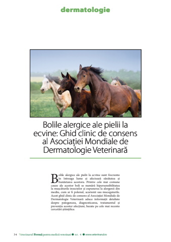 34 Veterinarul Ferm%u0103 pentru medicii veterinari l nr. 4 l www.veterinarul.rodermatologieBolile alergice ale pielii la ecvine sunt frecvente %u00een %u00eentreaga lume %u0219i afecteaz%u0103 s%u0103n%u0103tatea %u0219i bun%u0103starea acestora. Printre cele mai comune cauze ale acestor boli se num%u0103r%u0103 hipersensibilitatea la mu%u0219c%u0103turile insectelor %u0219i expunerea la alergenii din mediu, cum ar fi polenul, acarienii sau mucegaiurile. Acest ghid clinic de consens al Asocia%u021biei Mondiale de Dermatologie Veterinar%u0103 aduce informa%u021bii detaliate despre patogeneza, diagnosticarea, tratamentul %u0219i preven%u021bia acestor afec%u021biuni, bazate pe cele mai recente cercet%u0103ri %u0219tiin%u021bifice.Bolile alergice ale pielii la ecvine: Ghid clinic de consens al Asocia%u021biei Mondiale de Dermatologie Veterinar%u0103dermatologie