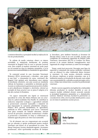 40 Veterinarul Ferm%u0103 pentru medicii veterinari l nr. 4 l www.veterinarul.roa antimicrobienelor %u0219i protej%u00e2nd mediul %u0219i mijloacele de trai ale produc%u0103torilor.%u00cen calitate de medic veterinar, observ cu interes activit%u0103%u021bile %u0219i ini%u021biativele desf%u0103%u0219urate de profesia veterinar%u0103 %u00een Regatul Unit %u00een ceea ce prive%u0219te sectorul ovin. Este evident c%u0103 medicii veterinari de acolo joac%u0103 un rol esen%u021bial nu doar %u00een s%u0103n%u0103tatea animalelor, ci %u0219i %u00een promovarea sustenabilit%u0103%u021bii %u0219i a bun%u0103st%u0103rii %u00een agricultur%u0103.%u00cen contextul actual, %u00een care Asocia%u021bia Veterinar%u0103 Britanic%u0103 (BVA) promoveaz%u0103 o abordare %u201emai pu%u021bin %u0219i mai bine%u201d a consumului de carne, veterinarii din Regatul Unit sprijin%u0103 activ dezvoltarea unor sisteme de produc%u021bie extensiv%u0103, care pun accent pe standarde ridicate de bun%u0103stare a animalelor %u0219i eficien%u021b%u0103 sporit%u0103. Aceasta se realizeaz%u0103 prin gestionarea proactiv%u0103 a bolilor %u0219i prin planificarea strategic%u0103 a efectivelor, oferind un exemplu de bune practici care ar putea fi adaptat %u0219i %u00een alte %u021b%u0103ri, inclusiv %u00een Rom%u00e2nia.Un aspect remarcabil este faptul c%u0103 veterinarul specializat %u00een ovine din Marea Britanie este un actorcheie %u00een cadrul modelului One Health. Ei contribuie la reducerea amprentei ecologice a agriculturii animale %u0219i promoveaz%u0103 consumul sustenabil, o ini%u021biativ%u0103 tot mai important%u0103 %u00een contextul schimb%u0103rilor climatice. Politica BVA privind durabilitatea %u00een agricultur%u0103, publicat%u0103 %u00een 2019, subliniaz%u0103 acest lucru: veterinarii sunt p%u0103r%u021bi esen%u021biale ale lan%u021bului alimentar, oferind servicii de prevenire, tratament, monitorizare a bolilor %u0219i promovare a bun%u0103st%u0103rii, %u00een timp ce colaboreaz%u0103 cu industria agricol%u0103 pentru un viitor mai sustenabil.Un alt element care m-a impresionat este accentul pus pe educa%u021bie %u0219i sprijin profesional pentru medicii veterinari care doresc s%u0103 se specializeze %u00een ovine. The Sheep Veterinary Society, denumit%u0103 sugestiv %u201eSocietatea prietenoas%u0103%u201d, ofer%u0103 oportunit%u0103%u021bi excelente de %u00eenv%u0103%u021bare %u0219i dezvoltare, prin %u00eent%u00e2lniri bianuale %u0219i forumuri de discu%u021bii clinice, toate la un cost accesibil. Acestea sunt completate de evenimente organizate de British Cattle Veterinary Association (BCVA) %u0219i London Vet Show, precum %u0219i de sesiuni dedicate rumeg%u0103toarelor mici organizate de colegii veterinare %u0219i centre de investiga%u021bii.Totu%u0219i, exist%u0103 %u00eenc%u0103 provoc%u0103ri. Percep%u021bia unei lipse de expertiz%u0103 %u0219i entuziasm din partea medicilor veterinari este un obstacol %u00een calea colabor%u0103rii dintre fermieri %u0219i veterinari. Cu toate acestea, eforturile continue de educare, implicare %u0219i sprijin comunitar, cum ar fi %u00eent%u00e2lnirile tematice %u0219i forumurile de discu%u021bii, sunt solu%u021bii care au poten%u021bialul de a schimba aceast%u0103 percep%u021bie %u0219i de a crea o rela%u021bie mai str%u00e2ns%u0103 %u00eentre cresc%u0103tori %u0219i profesioni%u0219tii veterinari.Exist%u0103 o nevoie urgent%u0103 la nivel global de a %u00eembun%u0103t%u0103%u021bi eficien%u021ba produc%u021biei %u00een moduri durabile %u0219i care s%u0103 respecte mediul, utiliz%u00e2nd eficient resursele naturale %u0219i protej%u00e2nd bun%u0103starea animalelor %u0219i a de%u021bin%u0103torilor acestora. Medicul veterinar, lucr%u00e2nd %u00een parteneriat cu cresc%u0103torul de ovibe, este %u00een pozi%u021bia ideal%u0103 pentru a juca un rol-cheie %u00een sprijinirea acestui proces.Radu Ciprian DVM, editor Revista Veterinarul