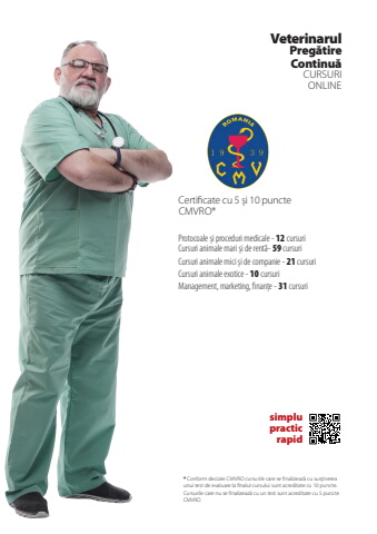 41VeterinarulPreg%u0103tireContinu%u0103CURSURIONLINECertificate cu 5 %u0219i 10 puncteCMVRO*simplupracticrapidProtocoale %u0219i proceduri medicale - 12 cursuriCursuri animale mari %u0219i de rent%u0103- 59 cursuriCursuri animale mici %u0219i de companie - 21 cursuriCursuri animale exotice - 10 cursuriManagement, marketing, finan%u021be - 31 cursuri* Conform deciziei CMVRO cursurile care se finalizeaz%u0103 cu sus%u021binerea unui test de evaluare la finalul cursului sunt acreditate cu 10 puncte. Cursurile care nu se finalizeaz%u0103 cu un test sunt acreditate cu 5 puncte CMVRO