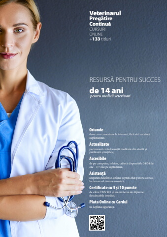 42 Veterinarul Ferm%u0103 pentru medicii veterinari l nr. 4 l www.veterinarul.roRESURS%u0102 PENTRU SUCCESde 14 ani pentru medicii veterinariOriundedoar cu o conexiune la internet, f%u0103r%u0103 nici un efort suplimentar,Actualizatepermanent cu informa%u021bii medicale din studii %u0219i publica%u021bii %u0219tiin%u021bifice,Accesibilede pe computer, telefon, tablet%u0103 disponibile 24/24 de ore - 7/7 zile pe s%u0103pt%u0103m%u00e2n%u0103, Asisten%u021b%u0103asigurat%u0103 telefonic, online %u0219i prin chat pentru a reu%u0219i %u00een demersul dumneavoastr%u0103,Certificate cu 5 %u0219i 10 punctede c%u0103tre CMVRO %u0219i cu emiterea de diplome desc%u0103rcabile imediat,Plata Online cu Cardul%u00een deplin%u0103 siguran%u021b%u0103.VeterinarulPreg%u0103tireContinu%u0103CURSURIONLINE+133 titluri