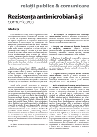 5rela%u021bii publice & comunicareRezisten%u021ba antimicrobian%u0103 %u0219iIulia Cre%u021buV%u0103 ve%u021bi %u00eentreba f%u0103r%u0103 doar %u0219i poate ce leg%u0103tur%u0103 este %u00eentre rezisten%u021ba antimicrobian%u0103 %u0219i comunicare? Nici una, ve%u021bi fi %u00eenclinat s%u0103 r%u0103spunde%u021bi. Rezisten%u021ba antimicrobian%u0103 are leg%u0103tur%u0103 cu practicile de cre%u0219tere ale animalelor %u0219i administrarea de medicamente, iar comunicarea are leg%u0103tur%u0103 cu transmiterea informa%u021bilor. Ve%u021bi fi surprin%u0219i s%u0103 afla%u021bi c%u0103 cele dou%u0103 sunt extrem de str%u00e2nd legate, mai multe studiii recente ar%u0103t%u00e2nd c%u0103 o calitate ridicat%u0103 a comunic%u0103rii %u00eentre medicul veterinar %u0219i fermier, al%u0103turi de nivel de %u00eencredere ridicat pot ac%u021biona drept catalizator pentru implementarea unor strategii de utilizare prudent%u0103 a antimicrobienilor. Desigur, studiile au ar%u0103tat c%u0103 aceast%u0103 component%u0103 a comunic%u0103rii poate ac%u021biona %u0219i ca un obstacol %u00een calea acestor strategii, atunci c%u00e2nd rela%u021bia dintre fermier %u0219i medicul veterinar este una deficitar%u0103. Dar s%u0103 %u00eencepem cu %u00eenceputul. Rezisten%u021ba antimicrobian%u0103 (RAM) reprezint%u0103 o provocare la nivel global, av%u00e2nd implica%u021bii semnificative asupra s%u0103n%u0103t%u0103%u021bii umane %u0219i animale. %u00cen acest context, tot mai mul%u021bi cercet%u0103tori sunt convin%u0219i de faptul c%u0103 doar o bun%u0103 %u00een%u021belegere a comportamentelor %u0219i atitudinilor medicilor veterinari %u0219i a fermierilor deopotriv%u0103 vis-a-vis de utilizarea antimicrobienilor poate ajuta la identicarea credin%u021belor %u0219i motiva%u021biilor care le influen%u021beaz%u0103 practicile.Primul studiu privind comunicarea %u0219i rezisten%u021ba antimicrobian%u0103 despre care discut%u0103m %u00een acest articol a cercetat leg%u0103tura dintre cresc%u0103torul de vaci de lapte %u0219i medicul veterinar. Agricultura, %u00een special sectorul laptelui, este un domeniu unde utilizarea antimicrobienelor este r%u0103sp%u00e2ndit%u0103, ceea ce poate contribui la dezvoltarea RAM. Cercetarea realizat%u0103 de patru oameni de %u0219tiin%u021b%u0103 de la Institutul pentru Securitatea Global%u0103 a Alimentelor, din cadrul Universit%u0103%u021bii Queen Belfast, a %u00eencercat s%u0103 aduc%u0103 c%u00e2teva clarific%u0103ri cu privire la cuno%u0219tin%u021bele, atitudinile %u0219i percep%u021biile fermierilor de lapte %u0219i ale medicilor veterinari cu privire la rezisten%u021ba antimicrobian%u0103 %u0219i practicile antimicrobiene. Plec%u00e2nd de la o cercetare a literaturii de specialitate, autorii studiului %u201eUnderstanding farmers%u2019 and veterinarians%u2019 behavior in relation to antimicrobial use and resistance in dairy cattle: A systematic review%u201dpublicat %u00een Journal of Dairy Science au analizat 35 de articole din 349 identificate %u00een baze de date medicale din %u00eentreaga lume. Din datele str%u00e2nse au reie%u0219it cinci teme cheie care au fost studiate:1. Cuno%u0219tin%u021bele %u0219i con%u0219tientizarea rezisten%u021bei antimicrobiene: nivelul de informare al fermierilor %u0219i medicilor veterinari variaz%u0103 semnificativ, influen%u021b%u00e2nd gradul de %u00een%u021belegere %u0219i con%u0219tientizare a riscurilor asociate utiliz%u0103rii excesive a antimicrobienelor.2. Factorii care influen%u021beaz%u0103 deciziile fermierilor %u0219i medicilor veterinari: Alegerea utiliz%u0103rii antimicrobienelor este determinat%u0103 de aspecte precum bun%u0103starea animalelor, costurile asociate, resursele disponibile %u0219i experien%u021ba practic%u0103 a celor implica%u021bi.3. Barierele %u0219i facilitatorii percepu%u021bi %u00een reducerea utiliz%u0103rii antimicrobienelor: printre bariere se num%u0103r%u0103 constr%u00e2ngerile economice, lipsa de timp %u0219i %u00eengrijor%u0103rile legate de bun%u0103starea animalelor, %u00een timp ce facilitatori importan%u021bi includ practicile %u00eembun%u0103t%u0103%u021bite de biosecuritate %u0219i educa%u021bia continu%u0103 a fermierilor %u0219i medicilor veterinari.4. Responsabilitatea perceput%u0103 pentru rezisten%u021ba antimicrobian%u0103: fermierii %u0219i medicii veterinari au percep%u021bii diferite asupra rolului lor %u00een prevenirea rezisten%u021bei antimicrobiene, ceea ce poate influen%u021ba adoptarea unor practici mai prudente.5. Rolul rela%u021biei dintre fermier %u0219i medicul veterinar %u00een reducerea utiliz%u0103rii antimicrobienelor: calitatea comunic%u0103rii %u0219i nivelul de %u00eencredere reciproc%u0103 %u00eentre fermieri %u0219i veterinari pot func%u021biona fie ca un obstacol, fie ca un catalizator pentru implementarea unor strategii de utilizare prudent%u0103 a antimicrobienelor.Medicii veterinari au fost sf%u0103tui%u021bi s%u0103 adopte noi stiluri de comunicare %u0219i s%u0103 dep%u0103%u0219easc%u0103 presupunerile pe care le pot avea despre fermieri pentru a asigura implicarea acestora %u00een prevenirea bolilor %u0219i gestionarea utiliz%u0103rii antimicrobienelor. De%u0219i mul%u021bi veterinari au subliniat c%u0103 percep%u021biile fermierilor influen%u021beaz%u0103 practicile lor de prescriere %u0219i adesea le limiteaz%u0103 eforturile de reducere a utiliz%u0103rii antimicrobienelor, pu%u021bini au identificat acest aspect %u00een mod explicit ca pe un obstacol %u00een reducerea acestora. Fiind o surs%u0103 de informa%u021bii de %u00eencredere pentru fermieri, medicii veterinari pot educa fermierii %u0219i pot promova reducerea utiliz%u0103rii antimicrobienelor. Prin schimbarea percep%u021biilor asupra clien%u021bilor lor, medicii veterinari pot ac%u021biona eficient ca administratori responsabili ai antimicrobienelor, men%u021bin%u00e2nd totodat%u0103 o rela%u021bie bun%u0103 cu fermierii. contribuie la reducerea utiliz%u0103rii antimicrobienelor.comunicarea